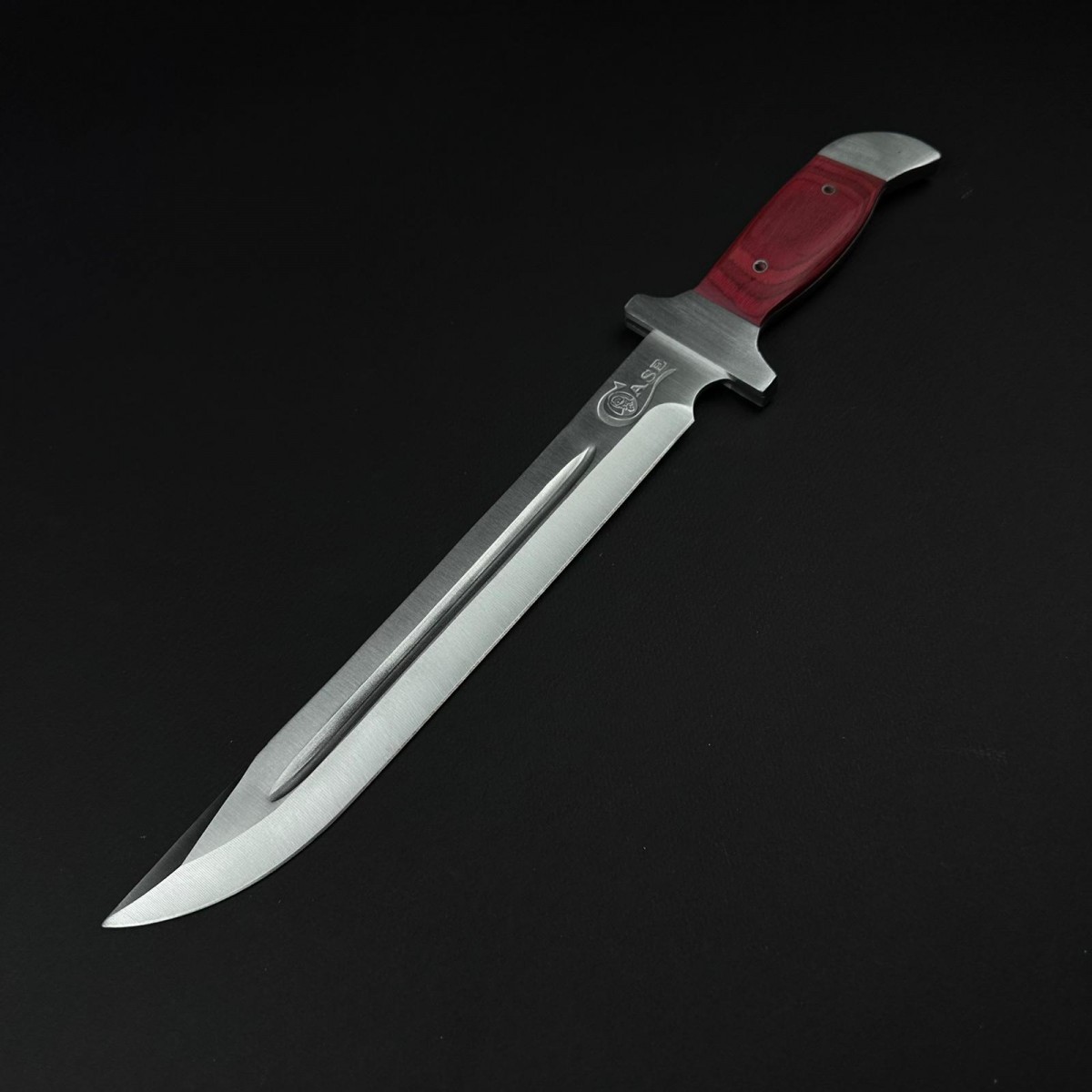 Cuțit cu lamă fix camping / tactic tip pumnal mare – lamă 24 cm oțel inoxidabil varf dublu tăiș, mâner lemn roșu-maron, total 38 cm, cu teacă piele neagră.