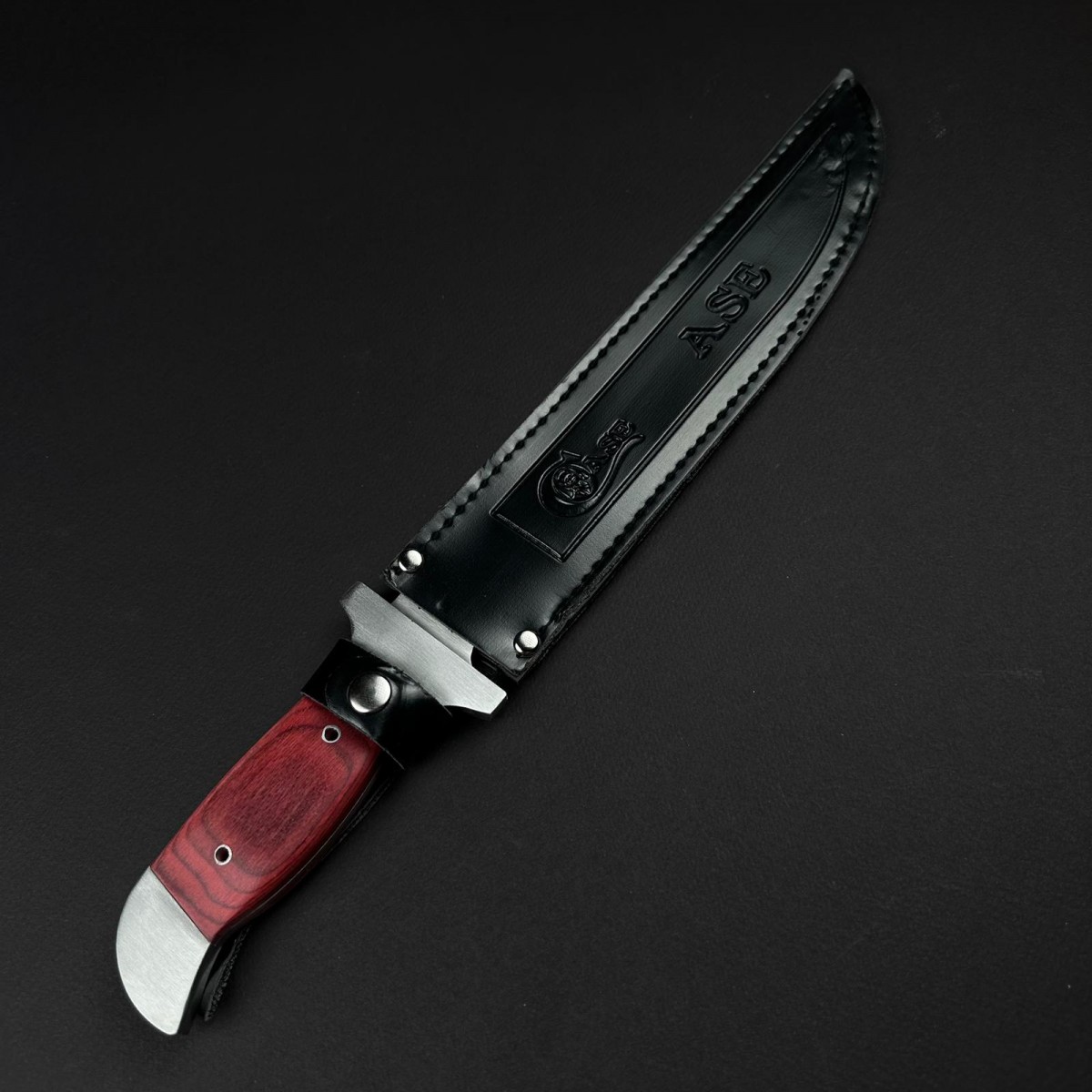 Un cuțit puternic, elegant și cu prezență tactică marcantă – lama dublu tăiș din oțel inoxidabil combinată cu mânerul din lemn roșu-maron și teaca din piele neagră îi conferă un look militar premium, cu funcționalitate reală pentru activități outdoor solicitante.