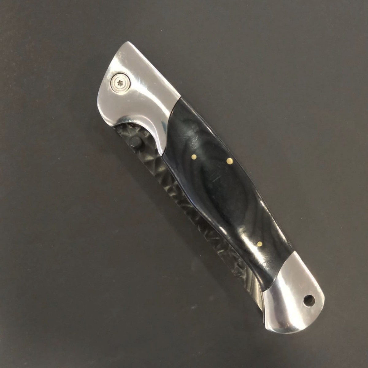 Cuțit briceag camping 26 cm, lamă 11 cm oțel damasc, mâner lemn negru cu accente metalice – Cod: BRC..