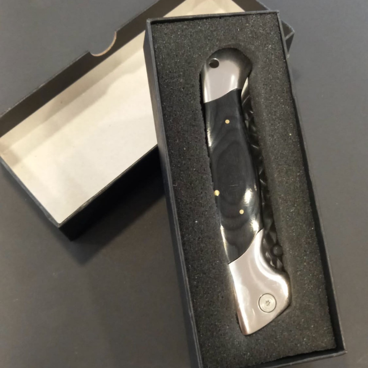 Cuțit tip briceag premium cu lamă damasc, conceput pentru camping, bushcraft, vânătoare ușoară și aventuri în natură. Lama de 11 cm din oțel damasc oferă un pattern spectaculos, ascuțime excelentă și rezistență ridicată. Profilul clasic briceag asigură penetrare bună și control precis la tăiere. Mânerul ergonomic din lemn negru lucios cu accente metalice gravate oferă priză sigură, aspect elegant și senzație premium în mână. Construcție solidă – un companion stilat, puternic și funcțional pentru pasionații de outdoor.
