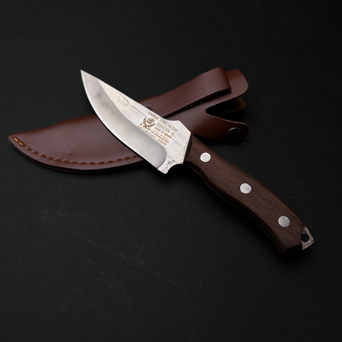 Cutit camping military 34cm, lama otel inox, maner lemn, teaca piele FR20