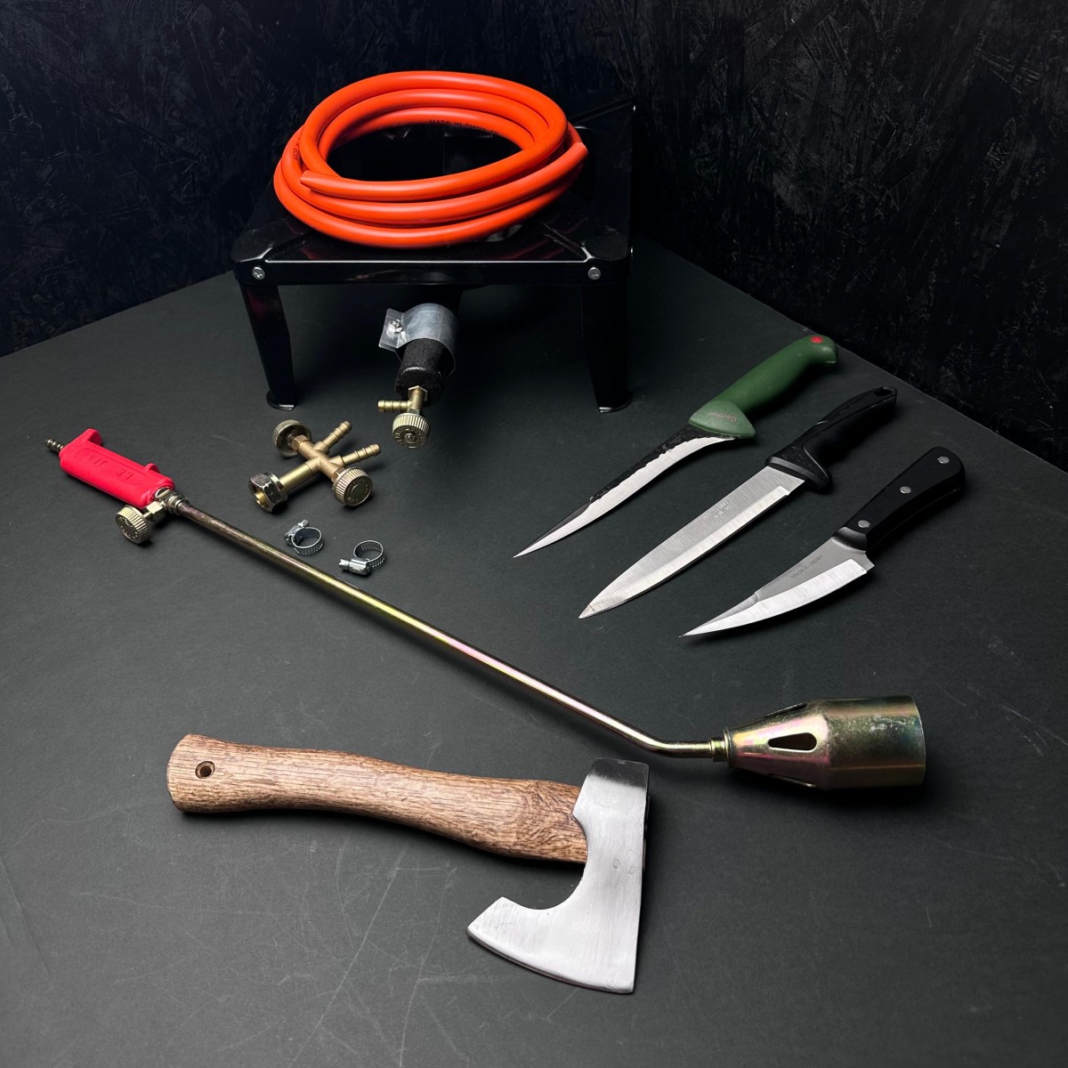Set Măcelărie 10 Piese – Arzător Mare 70 cm, Pirostrie 30 x 30 cm , Toporișcă, 3 Cuțite Profesionale și Furtun Gaz 5m cu Accesorii.