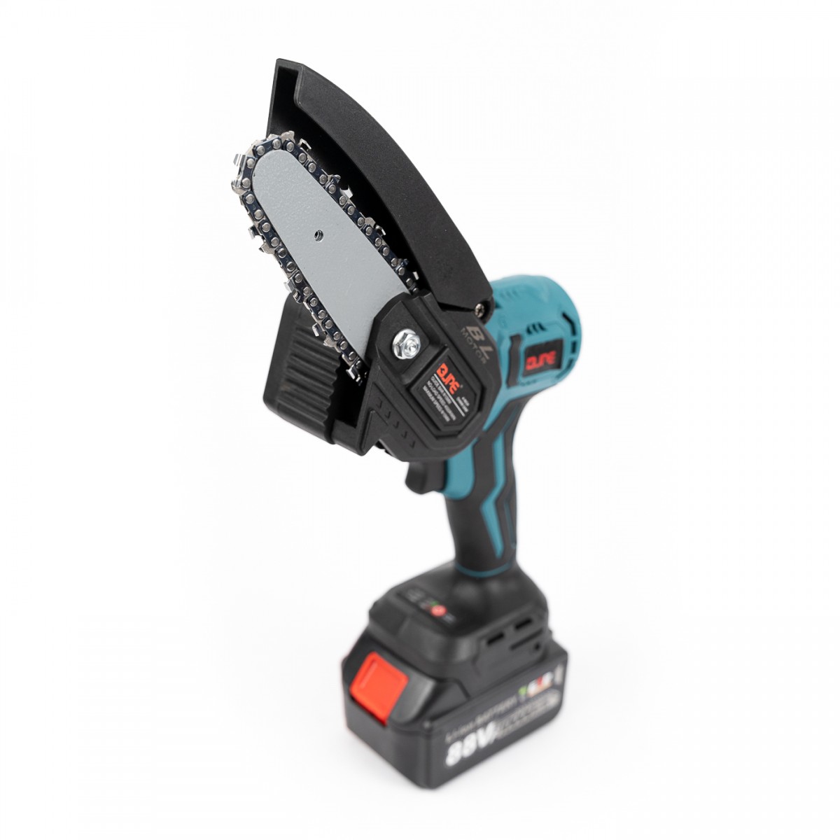 3. Ferastrau cu lant -MiniDrujba- cu lama scurta de 4inch si protectie, turatie 4000 rpm si adâncime de taiere 15cm.