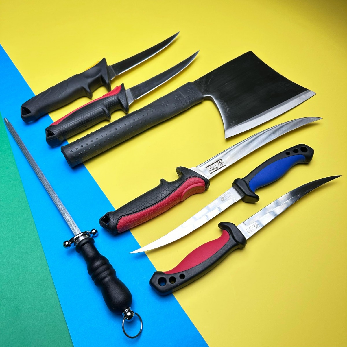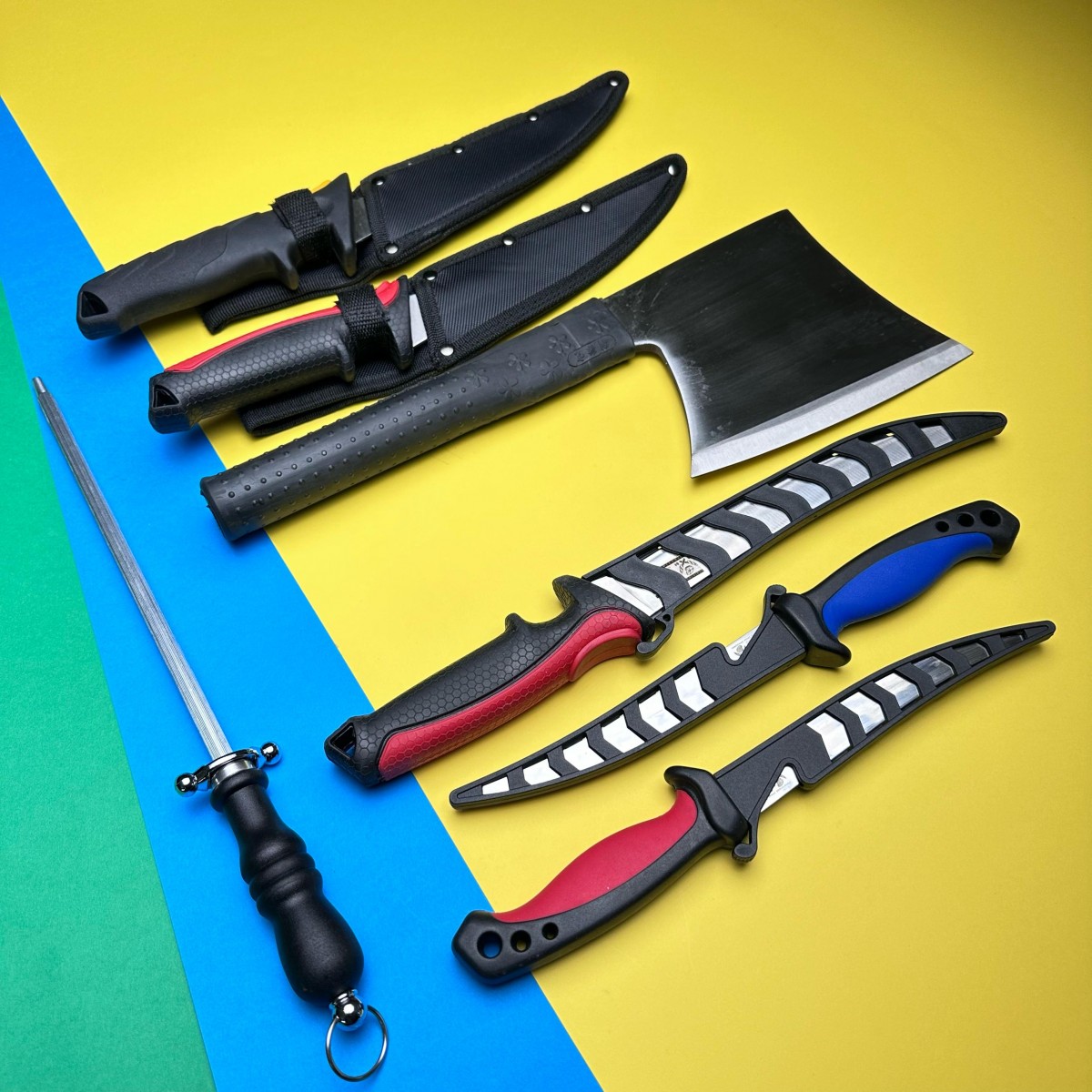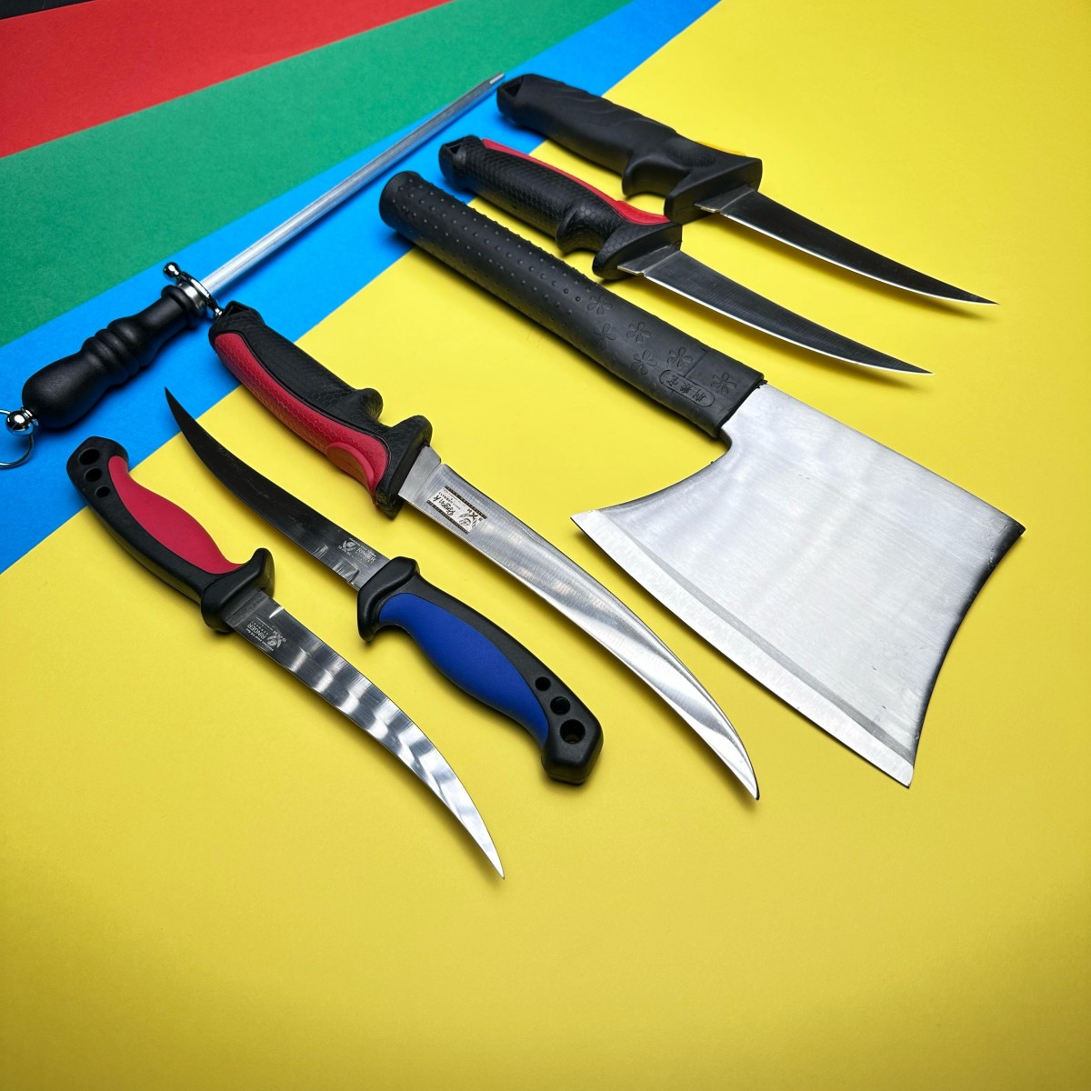 Set 15 piese Măcelărie Black Edition: Toporisca, 2 cuțite înjunghiat, 4 cuțite tranșat, 2 cuțite dezosat, 2 mănuși măcelar, 3 cârlige măcelărie, pilă masat