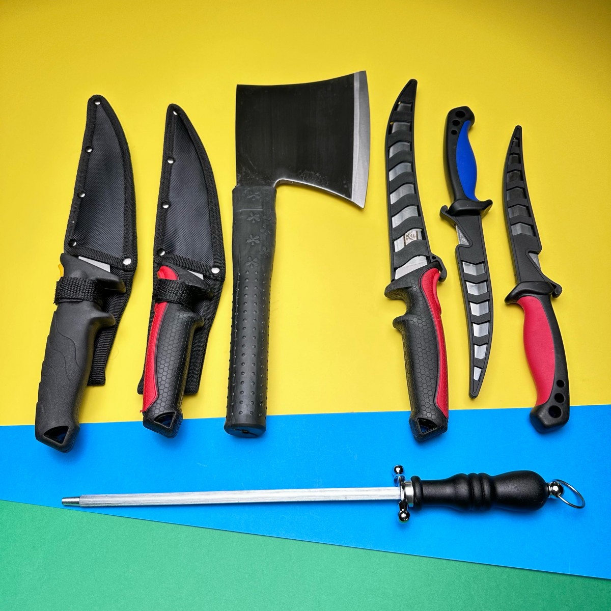 Setul contine:1buc. Toporisca despicat 34cm, lama de 11cm, coada de lemn1buc. Cutit macelarie dezosa..